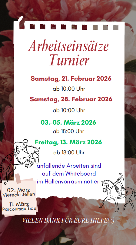 Seit Wochen laufen bereits im Hintergrund schon die Planungen des Reitturnieres 2026. Um nun die Anlage entsprechend Vorzubereiten bitten wir um Eure Hilfe.