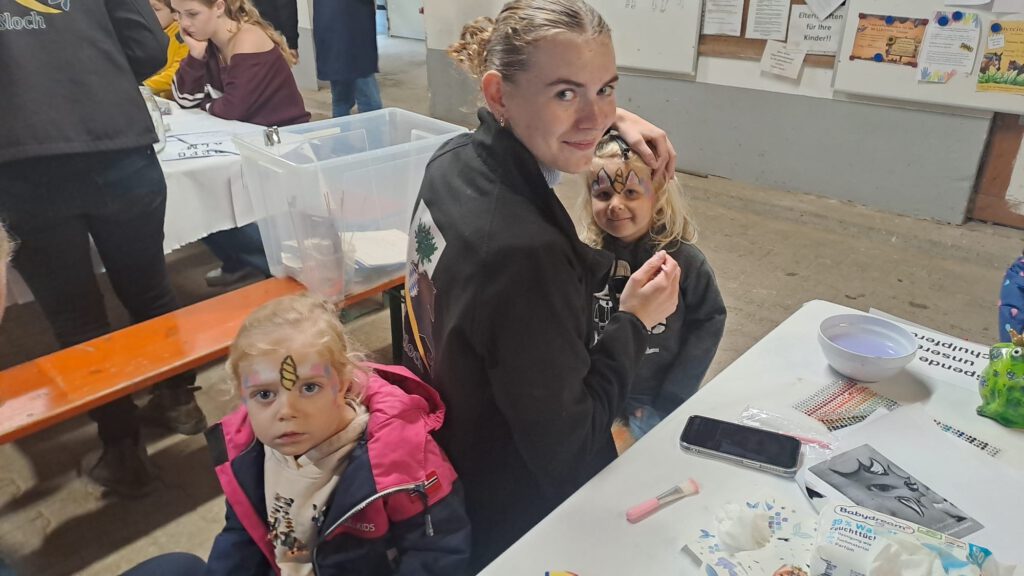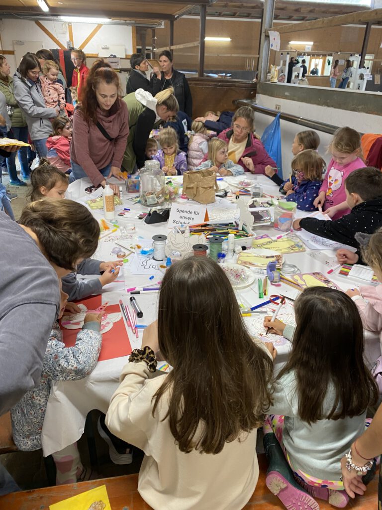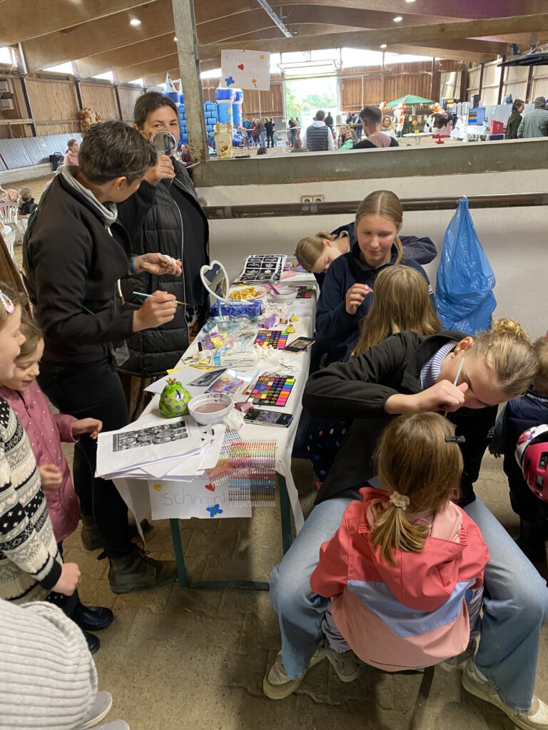 Beginnend mit dem Pony reiten ab 12 Uhr, waren unzählige Kinder gekommen um unsere Schulpferde zu reiten. Unsere Jugend hatte sich bestens vorbereitet und schminkte im Hallenvorraum den Kindern die unterschiedlichsten Tiere ins Gesicht. Die eigene Kreativität konnten die Kinder dann am Basteltisch ausleben. Auch die Hüpfburg war ein Highlight für die Kinder.
