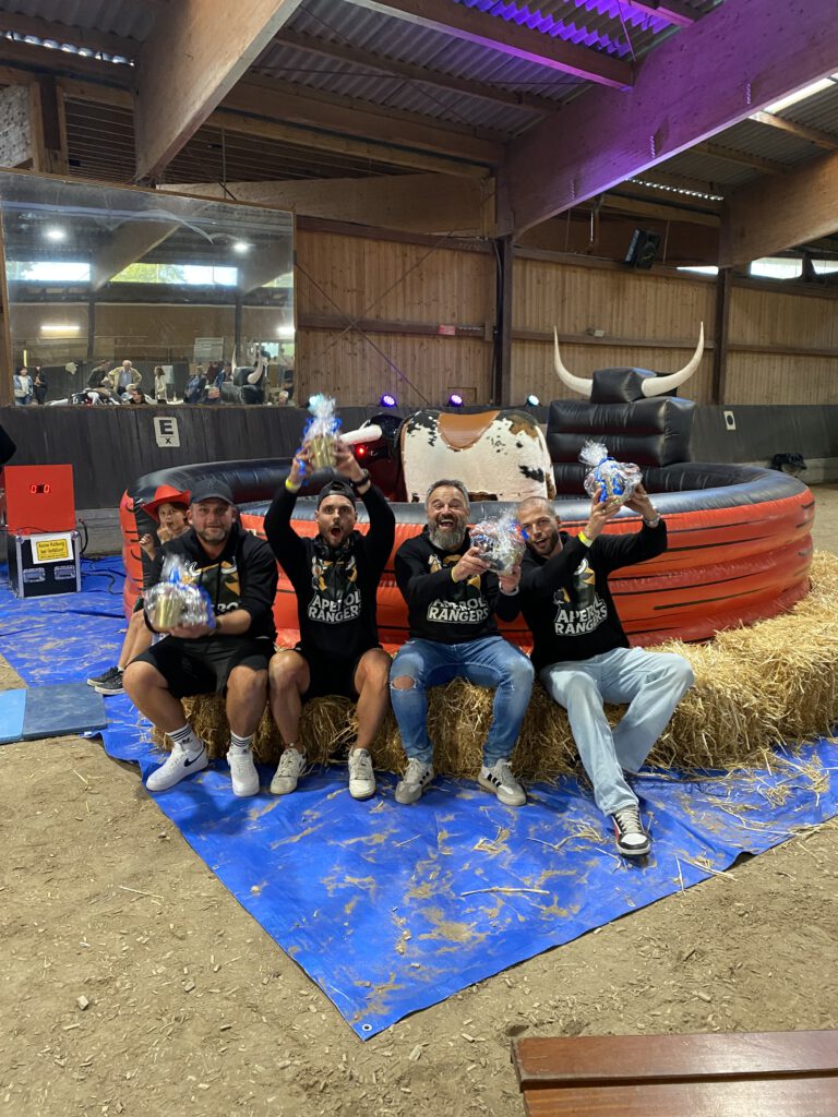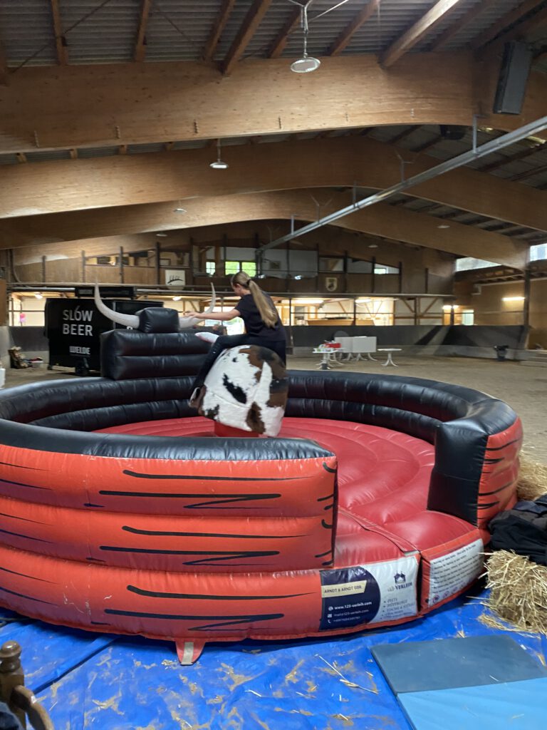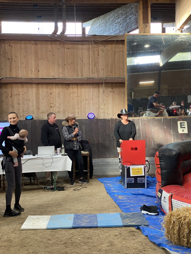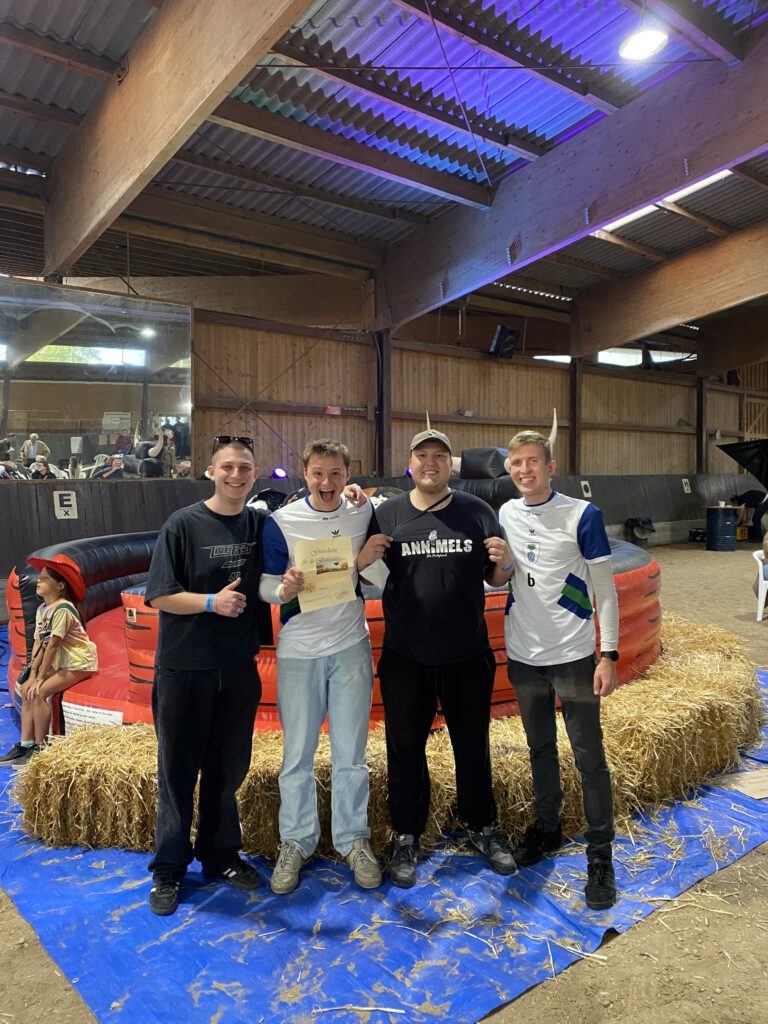 Um 15 Uhr fiel schließlich der Startschuss und unsere Ortsmeisterschaft im Bullriding begann. Starke 16 Teams hatten sich in die Starterliste eingetragen. Jeder Reiter durfte ein paar Probesekunden auf unserem Bullen sitzen, bevor es wirklich los ging. Gleiche Chancen für alle, 1 Ritt pro Reiter! Diese Sekundenzahl zählte schließlich ins Endergebnis: 4 Reiter je Team mit einem Streichergebnis. Wir sahen unglaubliche Ritte, mit toller Körperbeherschung auf unserem wilden Bullen, sogar in der höchsten Stufe. Andere fielen leider bereits in Stufe 1 ins Luftbett, aber Spaß hatte wohl jeder unserer Reiter
